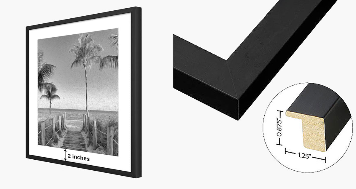We use solid wood frames and the matboard is a 4-ply white matte with an attractive bevel at 45 degrees. The backing is kraft paper dust cover with hanging wire included.